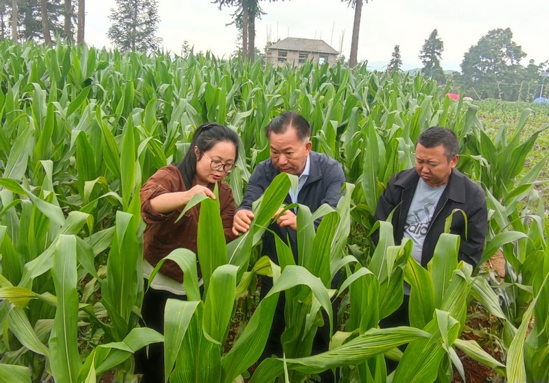 杨恩兰(左一)正在查看农作物病虫害防治情况。受访者供图