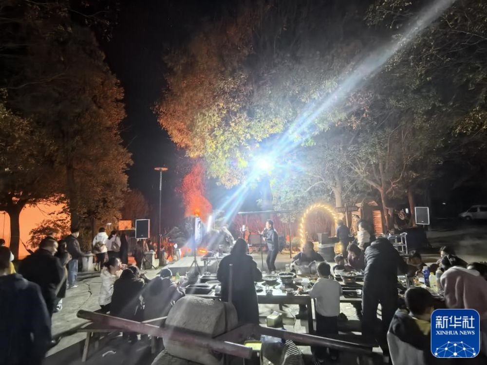 夜幕下的林桥生态农庄很是热闹,游客品美食、看表演、围篝火。(新华社客户端发 刘姗 摄)